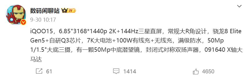搭载骁龙8 Elite Ge 5处理器跟投之家,内置7500mAh电池,支持100w有线充电+50w无线充电,有金属中框、IP68顶级防水。
