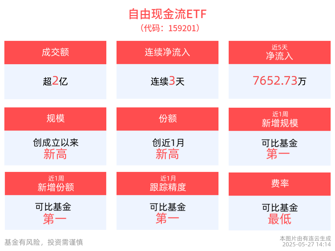 跟踪精度方面,截至2025年5月26日,自由现金流ETF近1月跟踪误差为0.014%,在可比基金中跟踪精度最高。